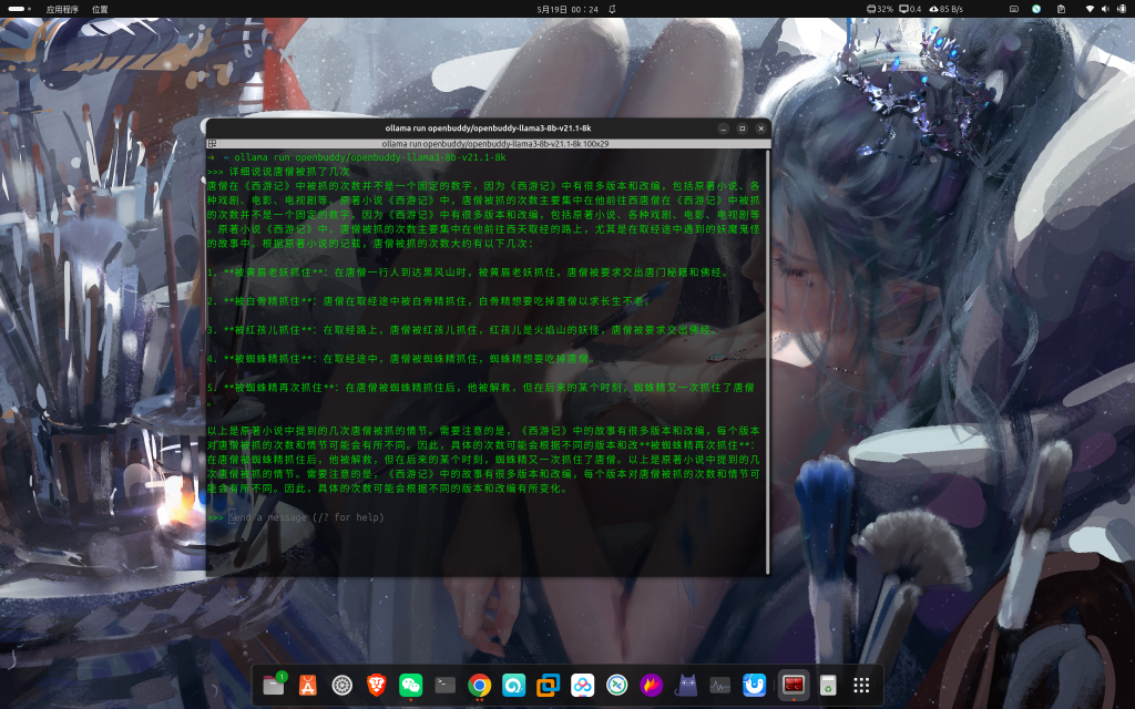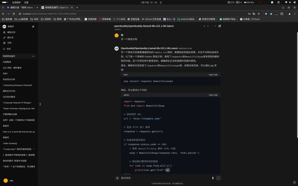 选择模型 openbuddy/openbuddy-llama3-8b-v21.1-8k:latest,即可在对话框中输入文字,开始对话。